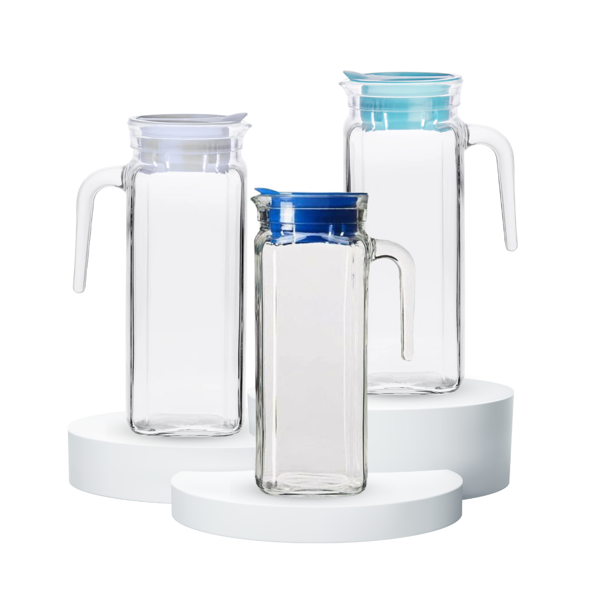 Botellas y jarras de vidrio con tapas de plástico, aluminio o cierre hermético, ideales para cualquier ocasión. Descubre soluciones prácticas que combinan estilo y funcionalidad en el almacenamiento y servicio de tus bebidas.