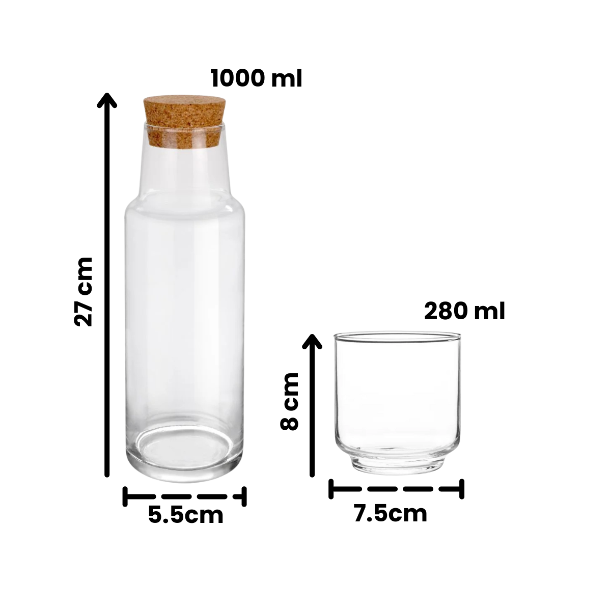 El set de botella con corcho y cuatro vasos de Borgonovo es ideal para quienes valoran tanto la calidad como el diseño. Con una capacidad de 1 litro, combina funcionalidad y elegancia, convirtiendo cada bebida en una experiencia única. Es perfecto para usar en la mesa de noche o para compartir con amigos, ideal para jugos, cócteles o agua.