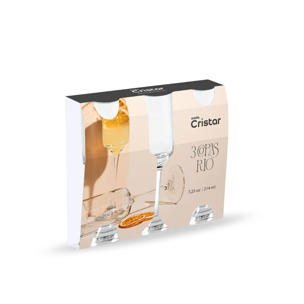 Set Rio de 3 copas flauta de vidrio transparente con diseño alargado, ideal para champaña y vinos espumosos. Se presentan en caja de presentación, pensada para regalo o cuidado premium del producto. Su estilo minimalista y clásico aporta elegancia a celebraciones especiales, eventos formales o uso cotidiano con un acabado más refinado.